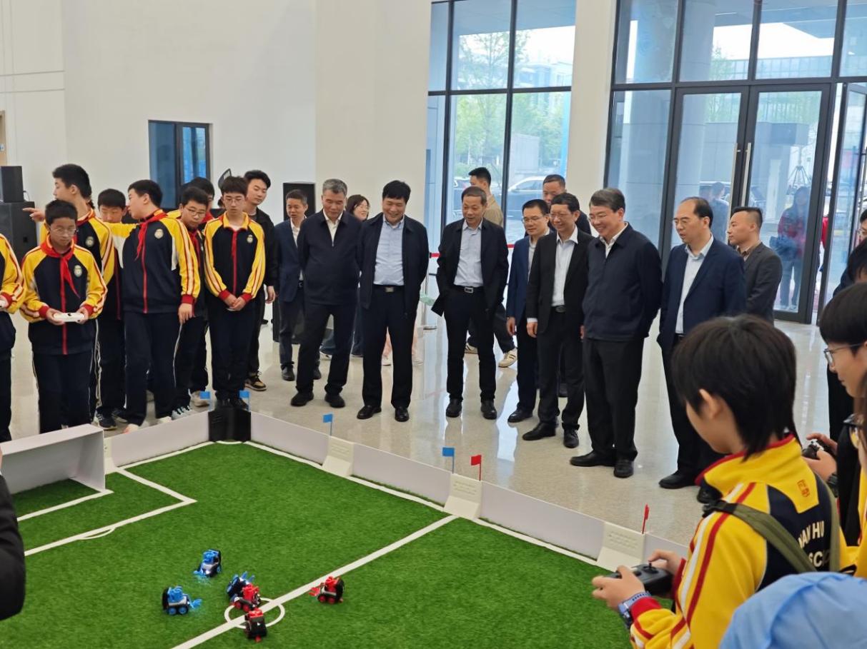 活动中,学生分组在专业教练指导下完成机器人小车组装、调试与参数设定,在3V3 机器人足球对抗赛中展开激烈角逐,丁汉、涂善东等多位院士专家听取活动专项汇报,深入了解学生创意与操作思路,高度评价活动的组织有序、专业水准及育人导向。期间,院士专家为优秀学生代表赠书,勉励青少年投身科创、勇攀高峰;学生还参观了校史馆、学院成果展及 3D 打印与机甲大师展示区,拓宽科学视野、激发科创热情。