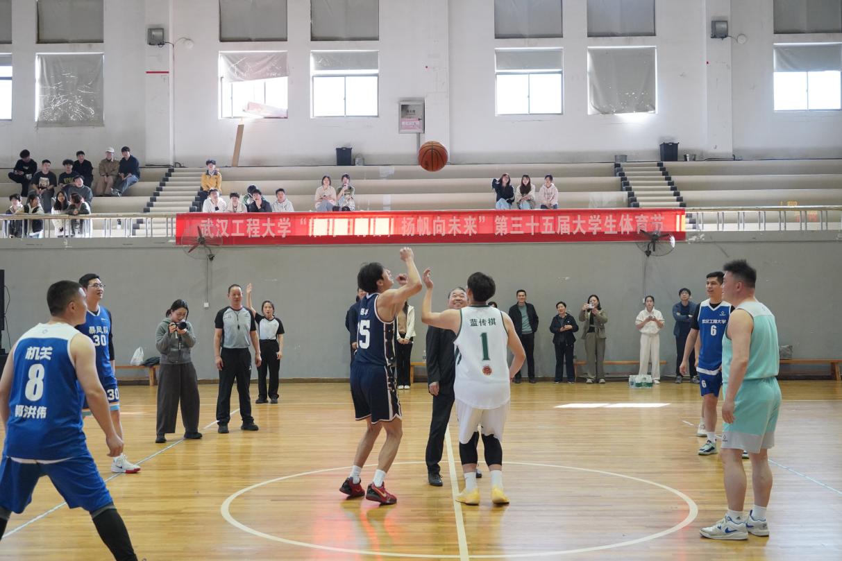 李志旭为机电学院学生、机关教工篮球友谊赛开球。